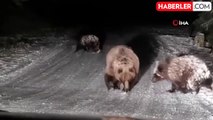 Ormanda karlı bir zemin üzerinde birbiriyle oynayan iki ayının görüntüsü hem izleyenleri gülümsetti hem de akıllara güreş sporunu getirdi.