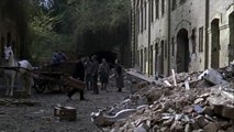 Escortée par bourreaux et soldats, une guillotine française traverse les lignes du front pour aller exécuter un condamné en Belgique.