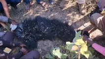 शिकारियों के फसाए जाल में फसा मादा भालू और उसका शावक मादा भालू की मौत शावक को ग्रामीणों ने बचाया।