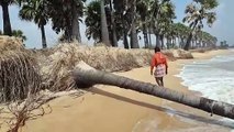 Continued sea erosion along Kulasekaranpatnam coast following Tiruchendur. More than 10 palm trees fell