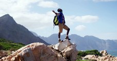 african american man standing on rock with arms wide open while trekking in the mountains