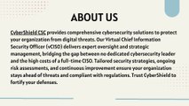 CyberShield CSC provides comprehensive cybersecurity solutions to protect your organization from digital threats. Our Virtual Chief Information Security Officer (vCISO) delivers expert oversight and strategic management, bridging the gap between no dedicated cybersecurity leader and the high costs of a full-time CISO. Tailored security strategies, ongoing risk assessments, and continuous improvement ensure your organization stays ahead of threats and compliant with regulations. Trust CyberShield to fortify your defenses.