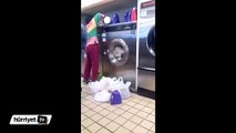 Neşeli temizlik işçisi hem işini yapıyor hem de gönlünce eğleniyor