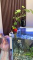 Un perroquet se baigne dans un aquarium