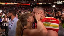 Taylor Swift and Travis Kelce share sweet embrace on field after Kansas City wins Super Bowl
