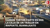 Camión torton choca y parte a la mitad caja de un tráiler en Irapuato
