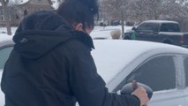 Family faces slippery ice outside their home and struggles to stay upright