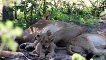 Lion cubs drinking from multiple lionesses