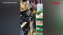 Un opossum spunta tra i peluche di in un negozio di souvenir dell'aeroporto