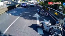 騎士疑壓到油漬摔車險被輾 後方3人急煞也跟著摔(翻攝畫面)