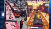 Hombre corre por encima de Transmilenios como juego de video