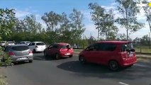 🏍️💥 Un motociclista decidió saltarse la caseta de cobro en la autopista de Ecatepec, sin imaginar que su acompañante no iba bien sujetada y terminó cay3ndo al asfalto.