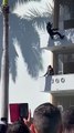 Des agents de sécurité descendent en rappel pour maîtriser un individu sur un balcon.