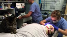 Cat comforts Labrador with tummy massage as he gets teeth cleaned