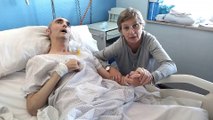 Mercedes, este lunes, en el Hospital Virgen de la Arrixaca de Murcia, con su hijo, Francisco Javier, víctima de una supuesta negligencia médica.