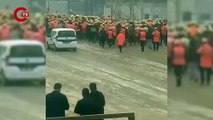 Polonez işçilerinin ters kelepçeyle gözaltına alınmasının ardından, çalışan işçiler eylem yaptı