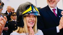 Giorgia Meloni col casco da pompiere a L'Aquila al giuramento degli allievi vigili del fuoco