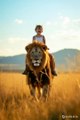 small baby is riding on lion and feeling so happy and enjoying