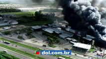 b'Imagens de drone mostram fogo e destruia7o na fa1brica da Cacau Show'