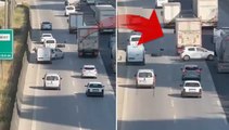 Adana'da otoyolda tırın tekerinden kopan lastik kaplaması, 5 otomobilin karıştığı zincirleme trafik kazasına neden oldu. Kaza, cep telefonuyla görüntülendi.