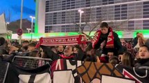 La afición del Mirandés recibe al equipo antes de la ida de la final del play off de ascenso
