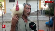 Mersin'de horozunu omuzunda gezdiriyor, gören dönüp bir daha bakıyor
