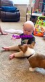 baby fun with dog . funny video baby and dog