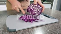 Closeup of a man slicing red cabbage in a kitchen home