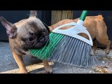 French Bulldog Playfully Stops Person From Brooming