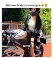 This man's lower body is a motorbike.