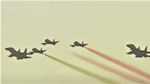 The footage features a stunning aerial display as jets soar overhead in perfect formation, leaving vibrant contrails in the colors of the Italian flag (green, white, and red) against the clear sky.