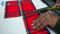 Then we cut the front part of the kilt, called the apron. We cut extra fabric to make pleats for both sides. Each pleat is folded and stitched carefully, then sewn across the top to keep them in place. Then we sew the pleated panels, the front apron, and the back together.