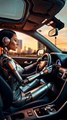 Metal and Rain: Robot Takes the Wheel""Future Drive: Humanoid Robot Steers Through Rainy City""Precision on Wheels: Robot's City Driv