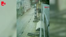 Meteoroloji'nin uyarısının ardından İstanbul'da fırtına etkili oluyor. Büyükçekmece'de kuvvetli rüzgar nedeniyle manavın şemsiyeleri uçtu. Şemsiyelerden birinin müşterinin üzerine düştüğü anlar güvenlik kamerasına yansıdı.