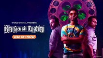 Credits: Movie - Nirangal Moondru Banner - Ayngaran international Produced by - K. Karunamoorthy Starring - Atharvaa, Sarath kumar, Rahman Written and directed by - Karthick Naren Music - Jakes Bejoy Cinematography - Tijo Tomy Editing and DI - Sreejith Sarang Production designer - Siva Sankar Costume designer - Ashok Kumar Stunts - Don Ashok VFX supervisor - Monesh H Sound design - SYNC CINEMA - Sachin Sudhakaran & Hariharan Stills - Karthick Srinevasan & Suresh Designs - Kabilan Chief associate director - Sivaram Ramanathan Associate directors - Harish Durairaj & Lokesh Gurunath P.R.O - Diamond Babu & Suresh Chandra & Rekha D'one Executive producer - Sundarrajan K Creative producer - Dr. Manoj Beno