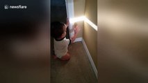 Adorable moment baby discovers his shadow