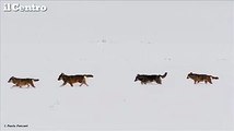 Opi, famiglia di lupi a caccia nella neve