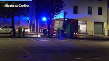 L?intervento dei vigili del fuoco in via della Repubblica per la caduta del semicappotto termico di un palazzo