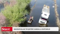 Taşkın sularının kapladığı yolda mahsur kalan tır şoförü sandalla kurtarıldı