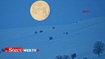 Karlı dağlar ile dolunay aynı karede güzel görüntüler oluşturdu