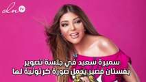 سميرة سعيد في جلسة تصوير بفستان قصير يحمل صورة كرتونية لها
