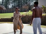 Muscle man outflexed by a woman at a game