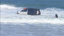 Hilux rolling into the surf creates an unreal scene at beach as two men chase after it