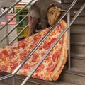 Guy In Rat Costume Drags Giant Pizza Up Subway Stairs