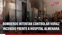 00:14y en relación a estos trabajos que vienen realizando los bomberos, dos de ellos, dos valerosos hombres de rojo han terminado heridos en sí, luego de que aparentemente, como están combatiendo también con estas grúas telescópicas, el agua desde la parte de arriba está tratando de combatir el fuego,