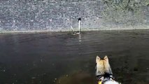 cute cat helps a cute dog, saving him from drowning,