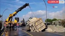 Balıkesir'de Yolda Oluşan Çukura Düşen Kamyon Vinçle Kurtarıldı