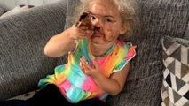 Little girl munches on ice cream and covers her whole face with it