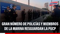 Usuarios reportaron que un gran contingente policial se ha hecho presente en los exteriores de la Universidad Nacional Mayor de San Marcos y la Pontificia Universidad Católica del Perú. Ello, debido a la marcha convocada para este viernes, 14 de noviembre.