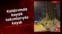 Kayseri'de kaldırımda kayak takımlarıyla kaydı